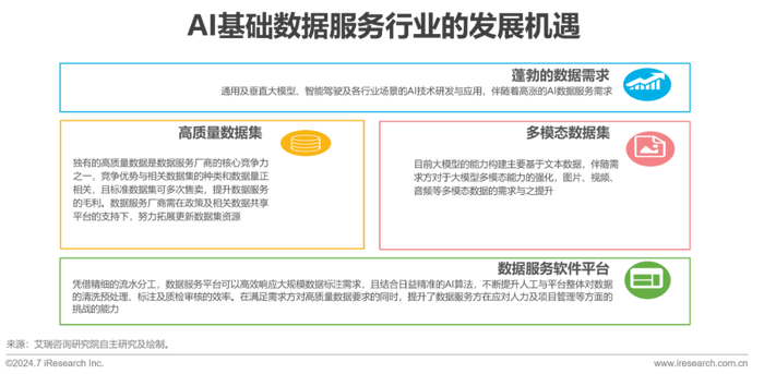 由于大模型对数据集的要求更加复杂、高质量数据需求的增加,以及需求方对数据安全及保护核心技术的重视,AI基础数据服务行业面临诸多挑战,包括数据标注工程师的门槛提升、项目管理复杂性增加、项目规模大、高质量数据获取困难、信息安全问题等。尽管面对挑战,行业也迎来了新的机遇。大模型等AI技术的快速发展带来了高涨的数据需求,推动了AI基础数据服务市场的增长,高质量数据集成为供应商的核心竞争力,此外,多模态数据集的需求也将增加。凭借精细的流水分工和日益精准的AI算法,数据服务软件平台在行业中的价值不断提升,平台可帮助服务方更好的满足需求方的高质量数据需求,应对好人力及项目管理方面的挑战。