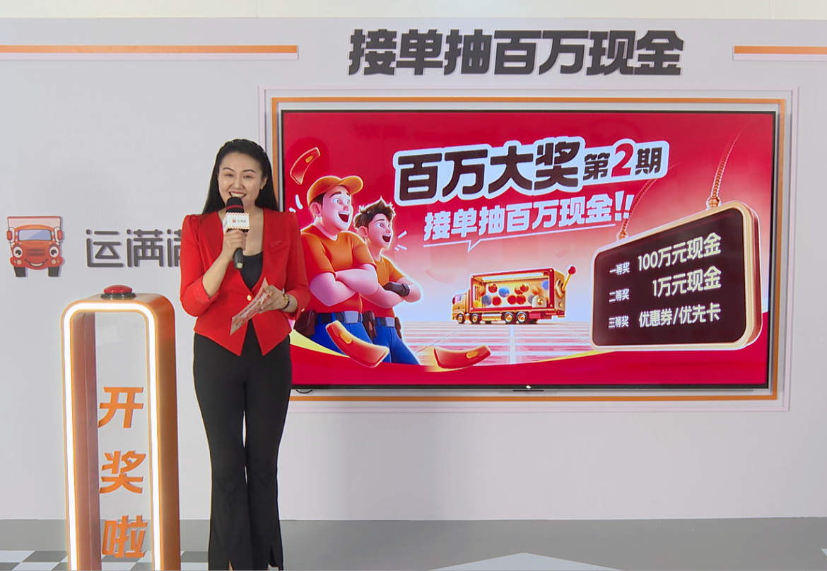 “接下来,让我们屏息以待,大屏幕正在滚动的是最后一个中奖号码,看看百万大奖花落谁家?一起倒数:3,2,1,停!”9月1日晚间7点多,首期运满满 “接单抽百万现金”活动在南京运满满总部正式开奖直播,现场不时传来热烈的欢呼声。