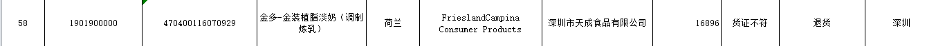来自荷兰的金多-金装植脂淡奶(调制炼乳)因为货证不符,被退货处理,生产商英文名称是FrieslandCampina Consumer Products,由深圳市天成食品有限公司负责进口。