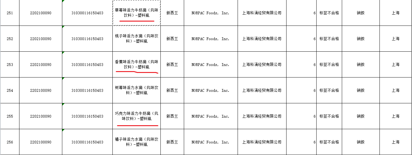 来自新西兰的草莓、香蕉和巧克力活力牛奶滴(风味饮料)-塑料瓶,因为标签不合格,全部被销毁处理,制造企业英文名称都是NORPAC Foods, Inc.,统一由上海科涌经贸有限公司负责进口。