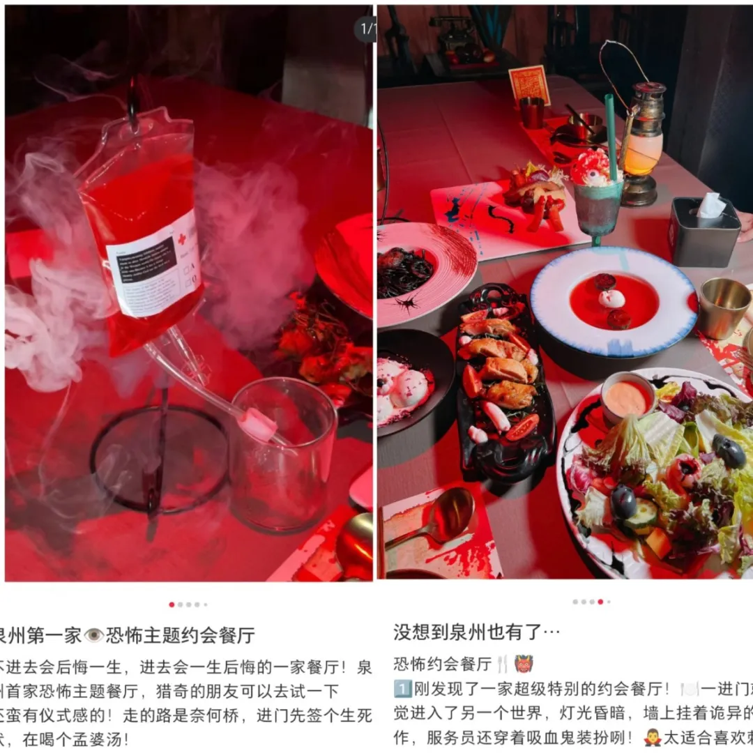在福建泉州,有一家恐怖主题餐厅主打密室逃脱+西餐。社交平台上不少年轻情侣前去打卡。