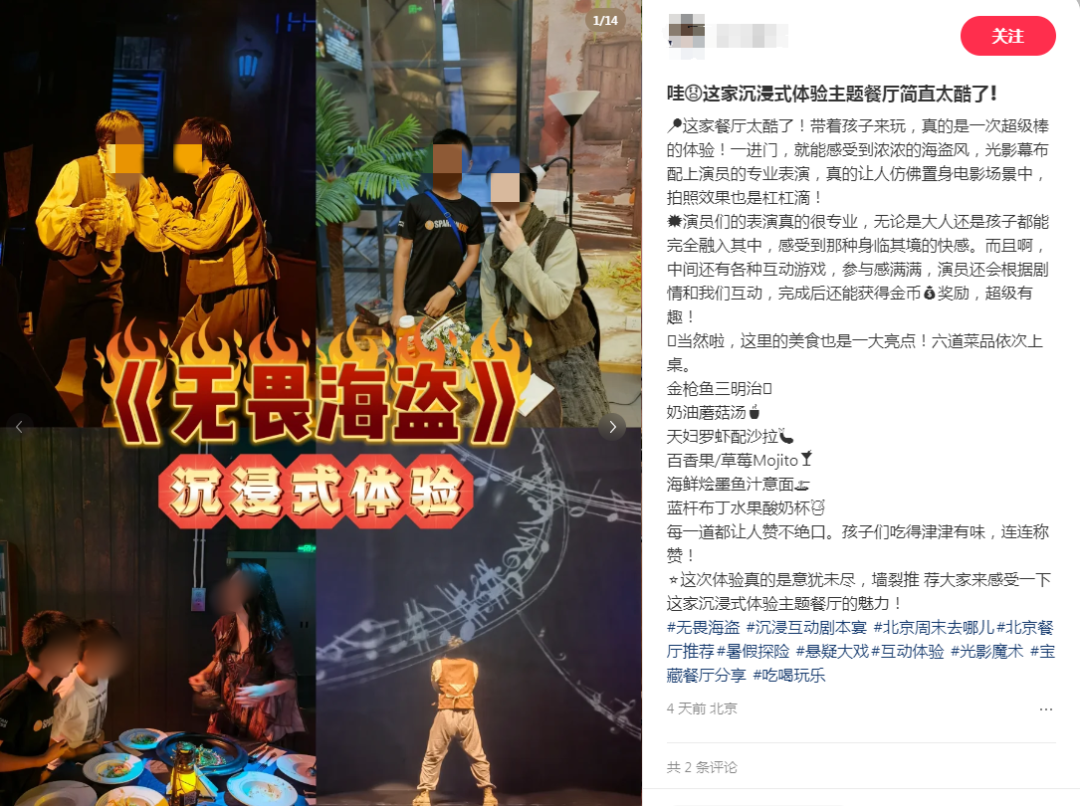 在北京,有一家“无畏海盗”主题“餐厅”把沉浸式戏剧表演和餐饮结合在一起,推出了奇幻海盗互动剧本宴,在社交平台颇受欢迎。