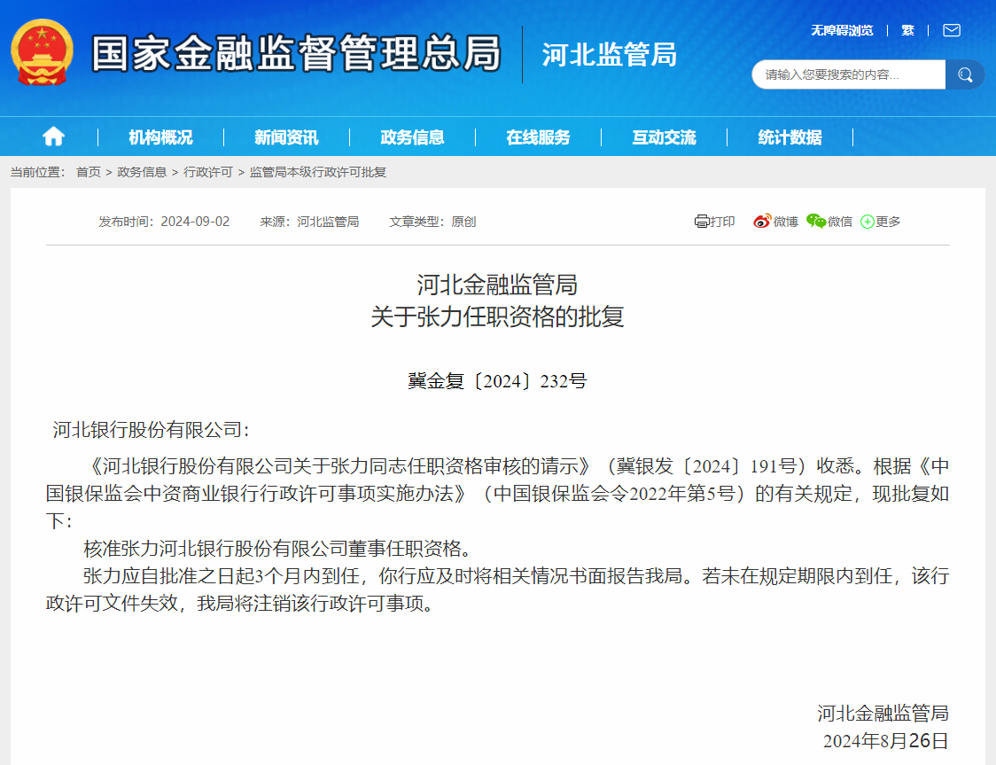 据国家金融监督管理总局网站显示,核准张力河北银行股份有限公司董事任职资格。