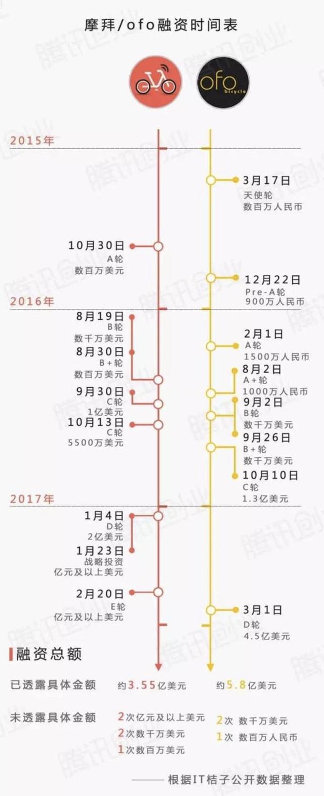 根据腾讯创业对公开资料的梳理,摩拜目前已进入E轮融资,总融资额约为3.55亿美元(约24.5亿元人民币);ofo已进入D轮,总融资额为5.8亿美元(约40亿元人民币)。
