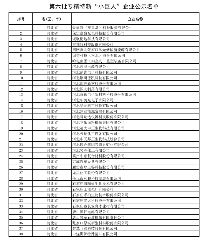 河北省第六批专精特新“小巨人”企业名单公布,共有38家企业入选。