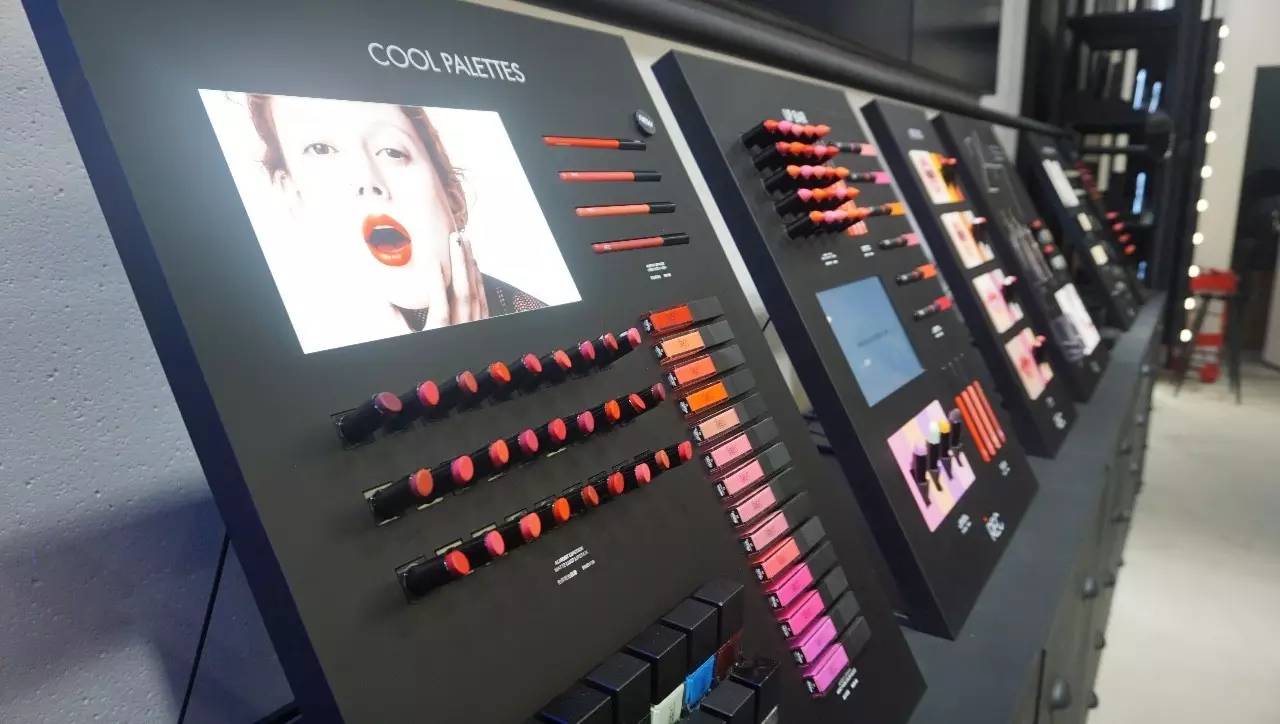 为了让消费者更好了解产品的妆效,每组产品陈列的展示柜都有一个相对应的动态TV画像。