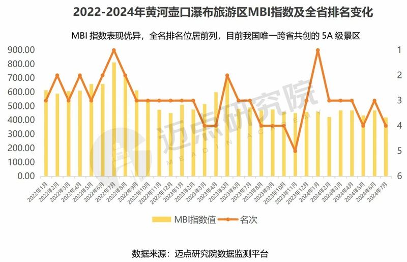 以5A级、4A级景区为重点监测样本,迈点研究院景区MBI数据显示:2021年至2024年山西省景区月度MBI指数整体呈现下滑趋势。但具体到各年度则存在较大差异、呈现不同特征,2021-2022年受外部“口罩”因素影响引起山西省景区MBI指数“跌宕起伏”和波动性特征明显;2023年政策宽松、市场复苏、消费促进等利好因素带动指数显著提升;2024年Q1,经济下行压力、文旅消费回归理性、运营成本增加等为景区经营带来挑战,山西景区MBI指数急速下降,但Q2开始则逐步上扬。6月“与辉同行”山西行主题活动宣推、7月2024年山西省旅游发展大会媒体聚焦和关注等都促使山西省各景区品牌知名度和影响力的扩大。