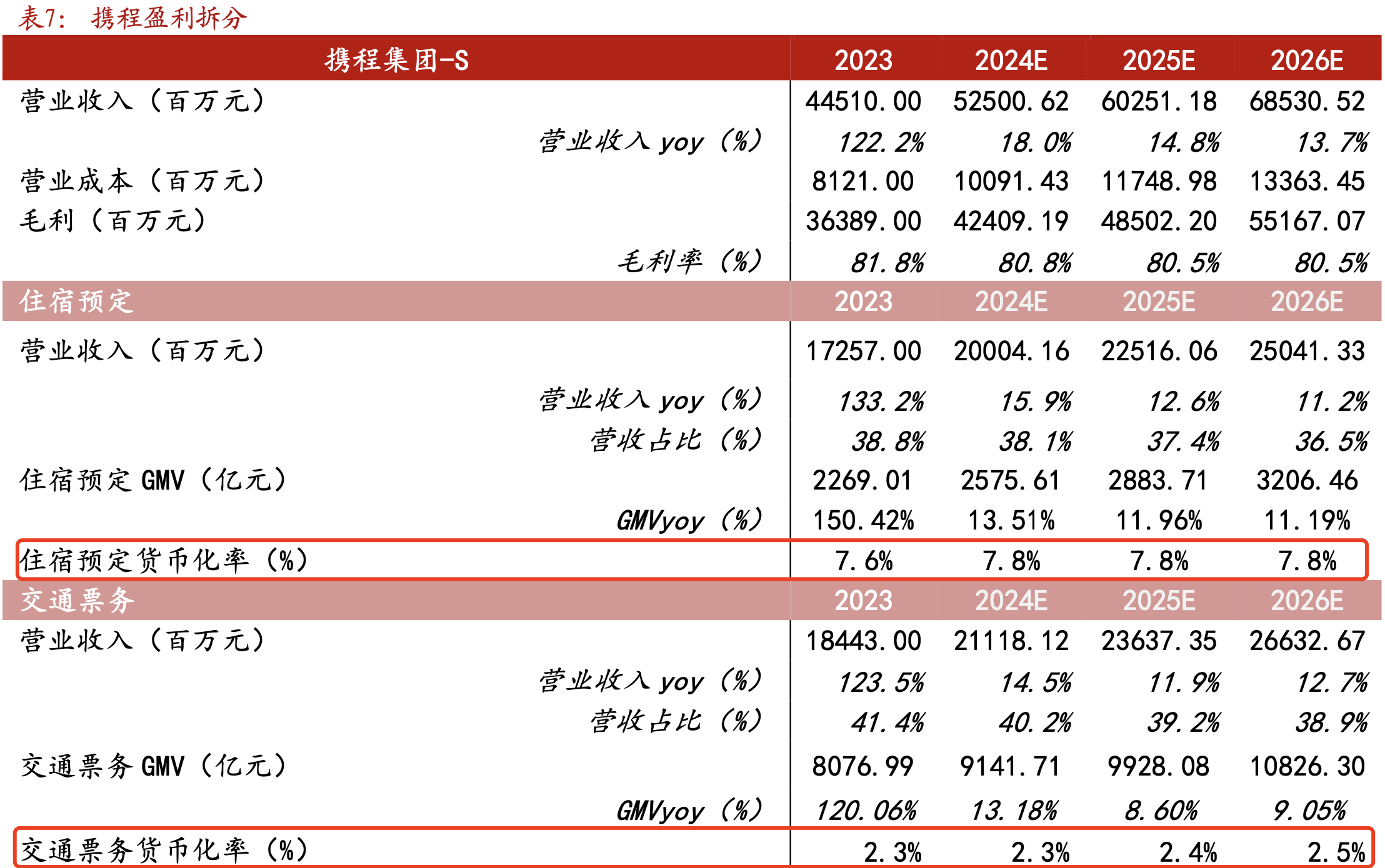 虽然在同程的收入结构中,住宿业务占比仅为28%,远低于交通票务业务的41%,但住宿业务的变现率却远高于交通业务。根据同程披露的数据,2017年住宿业务的变现率高达11%,是交通业务3%变现率的3.7倍。携程亦是如此,根据浙商证券在一份研报中的盈利拆分显示,2023年携程的住宿预定变现率为7.6%,是交通票务业务的3.3倍。