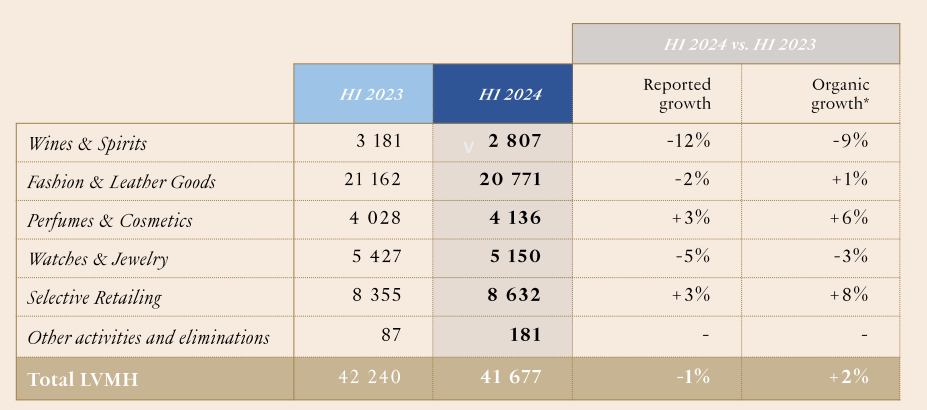 LVMH集团各部门业务表现 图源:LVMH集团2024年H1财报