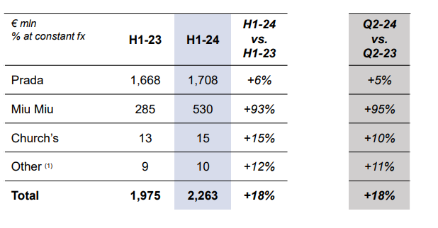 Prada集团各品牌业务表现 图源:Prada集团2024年H1财报