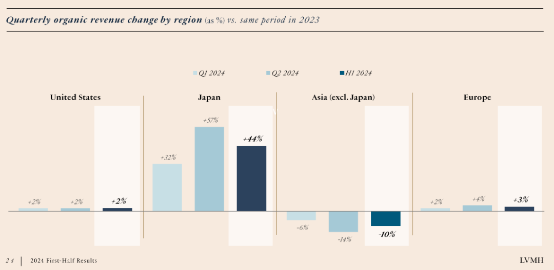LVMH集团各区域收入有机变动 图源:LVMH集团2024年H1财报