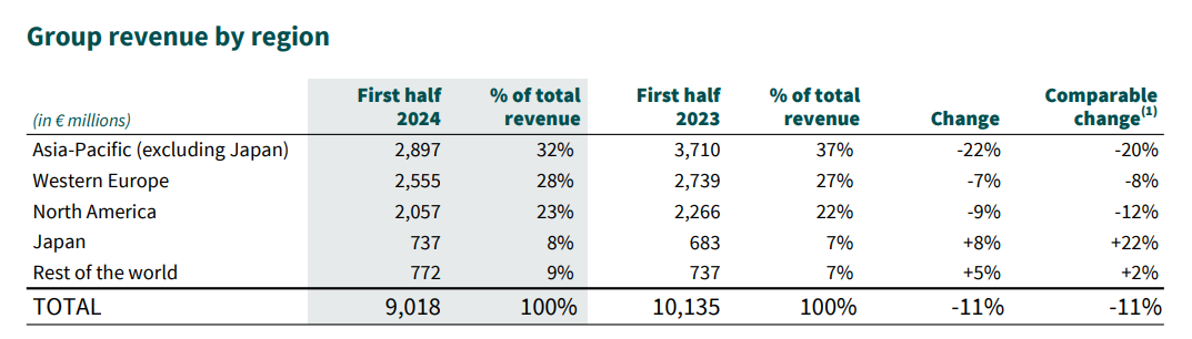LVMH、开云今年上半年的业绩不佳,很大程度受到了中国在内的亚太区(不包括日本)影响。前者接连两季度在亚太区有机营收增长为负,后者被亚太区高达22%的营收跌幅拖成吊车尾。