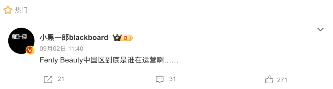 在微博上搜索Fenty Beauty,实时会出来一条“看完都不想买Fenty Beauty了”的热门推文。还有消费者批评称:“Fenty Beauty到底在干嘛,Kylie都不会这样宣传自己,背靠LVMH把自己做成Colorkey……神经,再也不会买了。”更有一名时尚博主,发出了“Fenty Beauty中国区到底是谁在运营”的疑问。