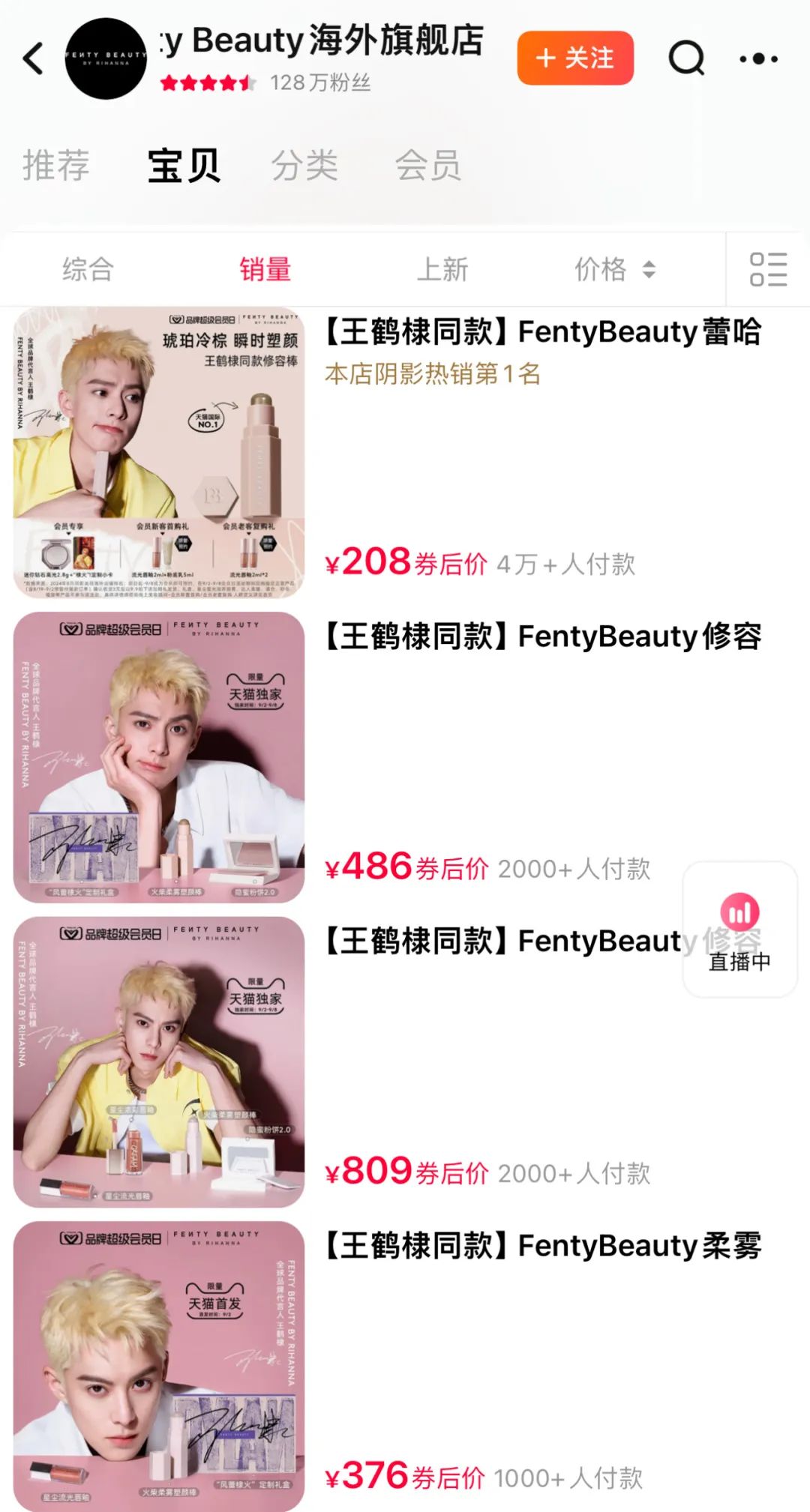 当前Fenty Beauty海外旗舰店销售靠前的均为【王鹤棣同款】