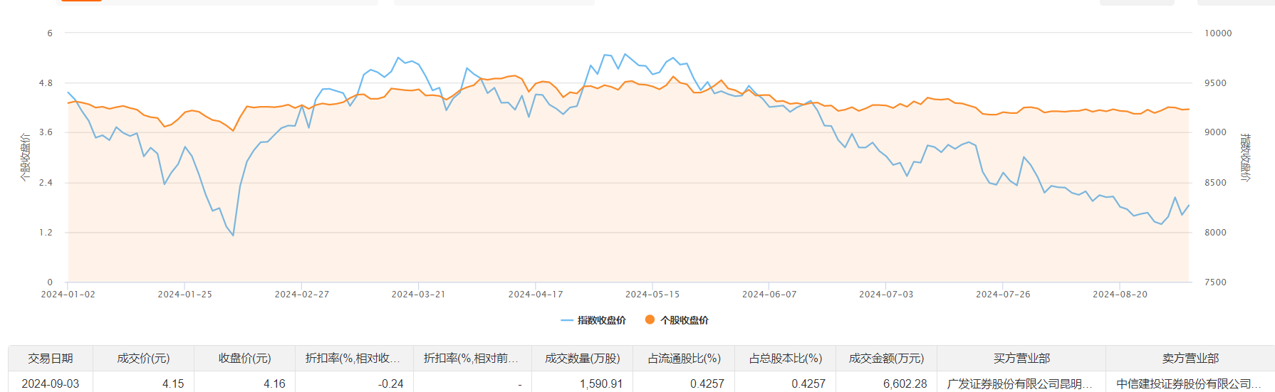 中金岭南今日大宗交易折价成交1590.91万股,成交额6602.28万元