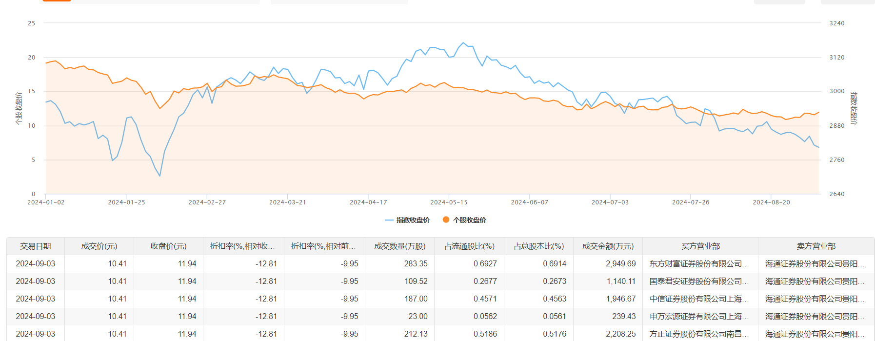 贵州三力9月3日大宗交易成交815万股,成交额8484.15万元,占当日总成交额的39.85%,成交价10.41元,较市场收盘价11.94元折价12.81%。