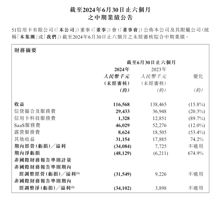 8月23日,51信用卡发布截至2024年6月30日止六个月的中期业绩。