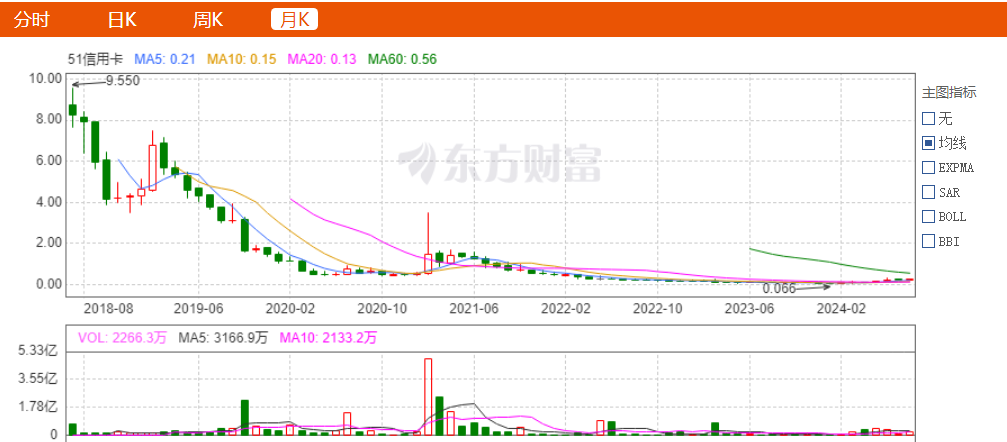 51信用卡上市之初股价曾一路涨至9.55港元/股,市值一度超百亿港元。但此后股价一路走低。