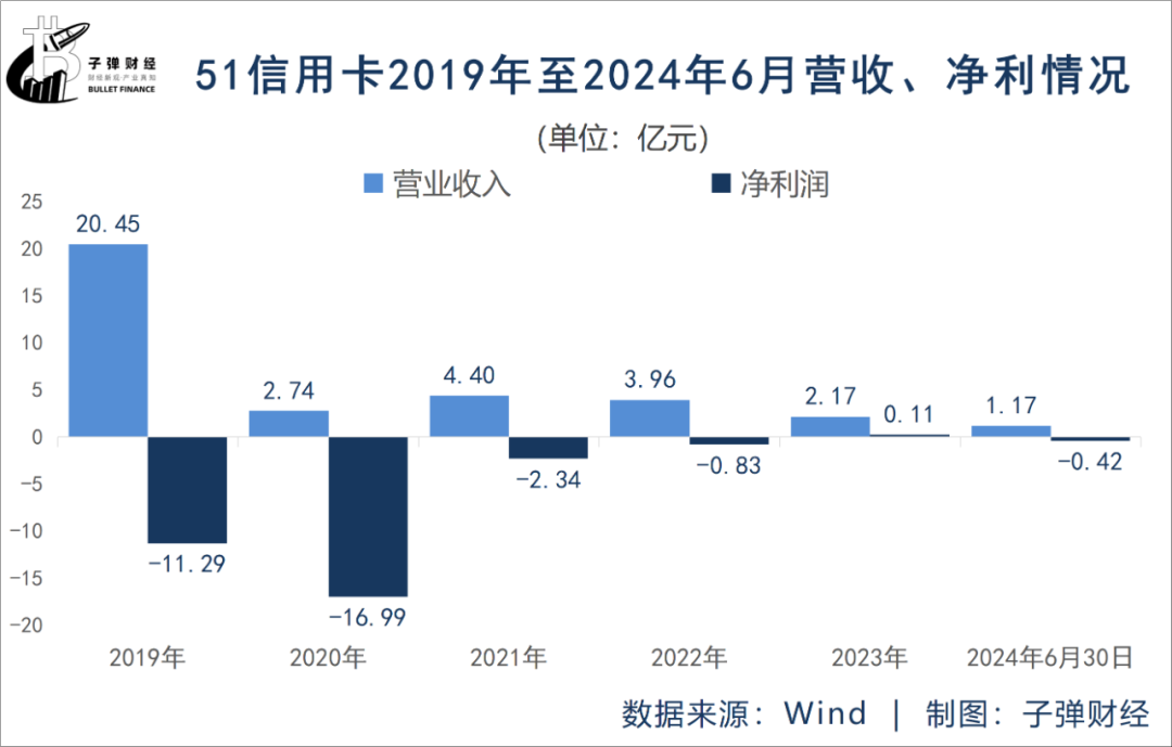 2019年至2023年,51信用卡分别实现营业收入20.45亿元、2.74亿元、4.40亿元,3.96亿元、2.17亿元;净利润分别为-11.29亿元、-16.99亿元、-2.34亿元、-0.83亿元、0.11万元,这5年中仅在2023年实现微弱盈利。