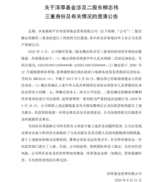 淳厚基金在8月31日的公告中称,2024年4月,公司确有发现柳志伟具有三重身份的切实有效证据线索,包括柳志伟持有两套中华人民共和国二代居民身份证,且不晚于2017年5月26日,柳志伟已经取得中国香港永久性居民身份。公司已经就证据线索及有关情况整理后正式向监管机构提交了相关报告,待监管机构进一步查证核实及出具处理意见。自发现柳志伟三重身份对公司造成的影响以来,淳厚基金立即切实做好了与该名股东及其关联人员的风险隔离切割措施。