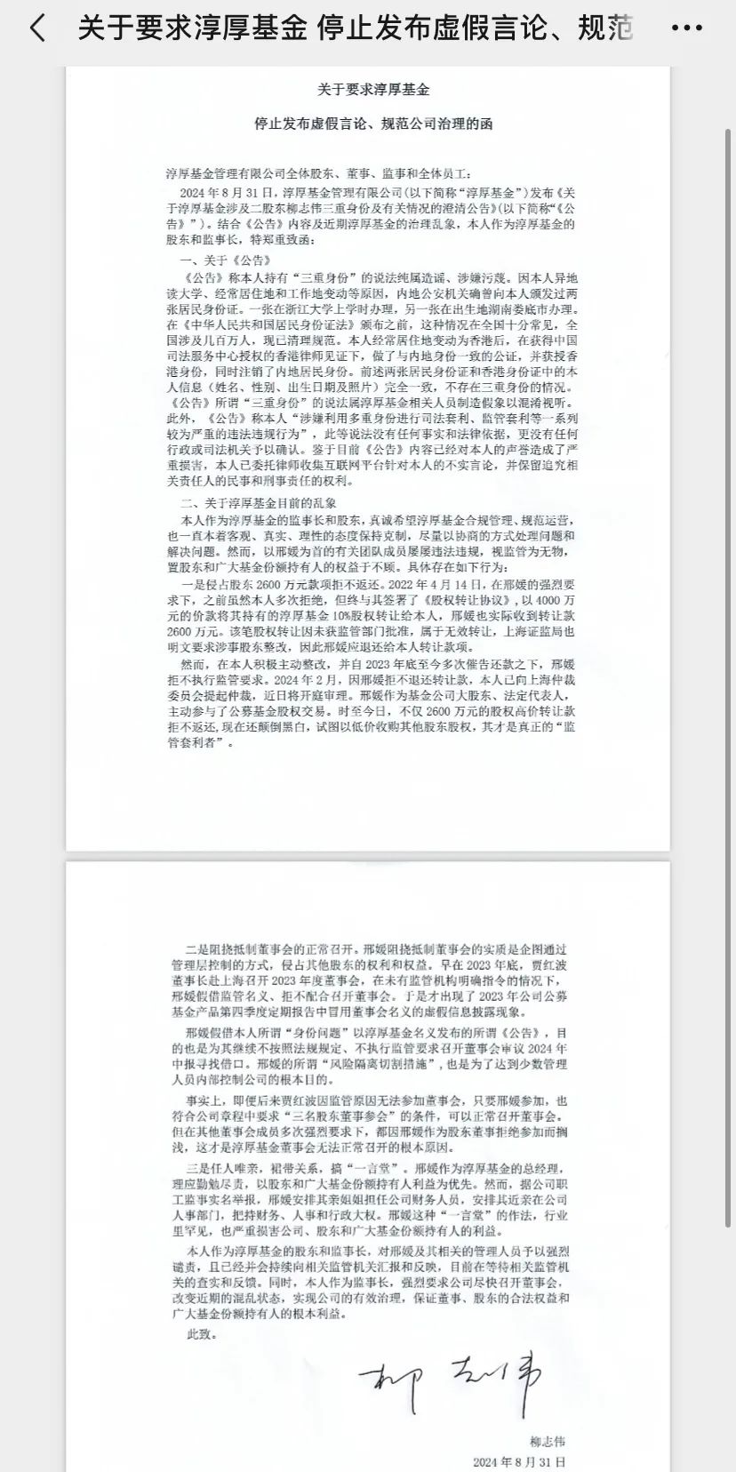 就在淳厚基金回应的第二天,柳志伟也对“三重身份”向淳厚基金全体股东、董事、监事和全体员工发送了一则《关于要求淳厚基金停止发布虚假言论、规范公司治理的函》(下称“《要求函》”)。