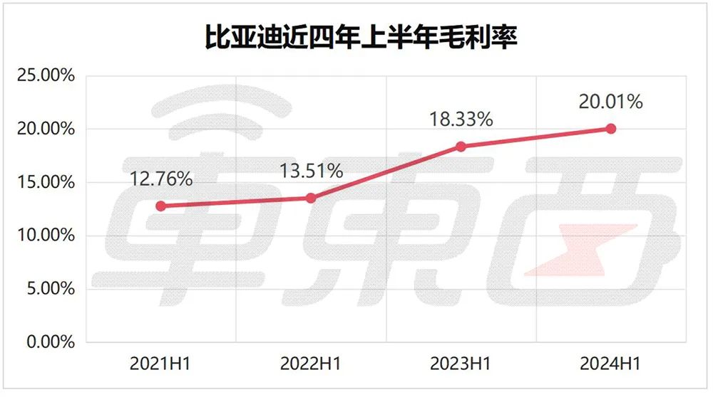 比亚迪近四年上半年毛利率分别为12.76%、13.51%、18.33%、20.01%,今年上半年比亚迪在增收增利方面还是实现了不小的突破。