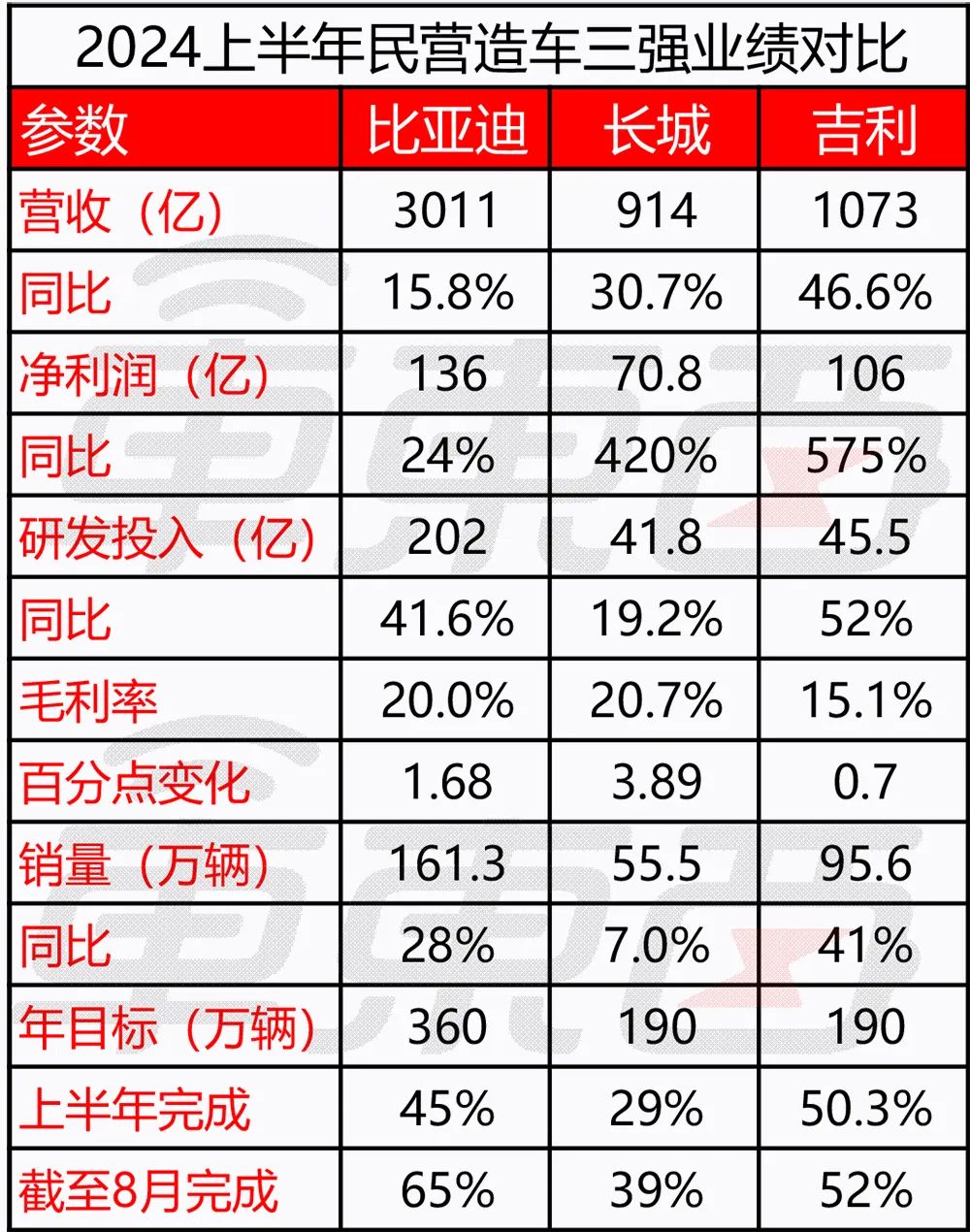 比亚迪、吉利、长城2024年上半年业绩对比