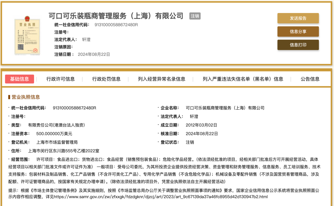 工商信息显示,8月29日,可口可乐装瓶商管理服务(上海)有限公司(下称:可口可乐装瓶管理)进行清算。在更早的8月22日,该公司状态由存续变更为注销,原因为决议解散。该公司由可口可乐旗下Coca-Cola Bottlers Manufacturing Holdings Limited(可口可乐装瓶商生产控股有限公司,下称:可口可乐装瓶控股)100%持股。