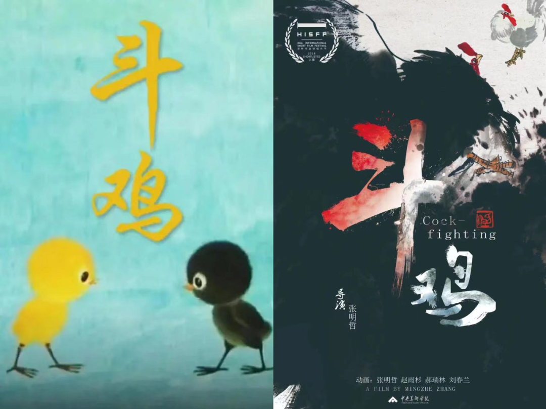 「葫芦娃之父」胡进庆导演于1988年完成水墨剪纸动画《斗鸡》,讲述了一枚蛋孵出的两只小公鸡,如何「本是同根生,相煎何太急」。这一短片采用了中国独创的水墨剪纸动画工艺,并采用了「羽贴」的技法,在两只公鸡身上贴了真的羽毛,让动物的形象和动作都更加活灵活现。