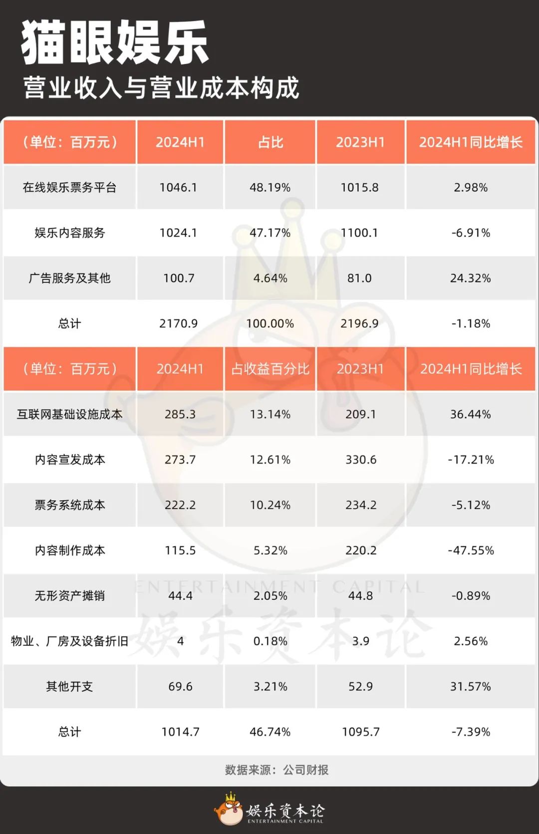 猫眼娱乐营业收入与营业成本构成