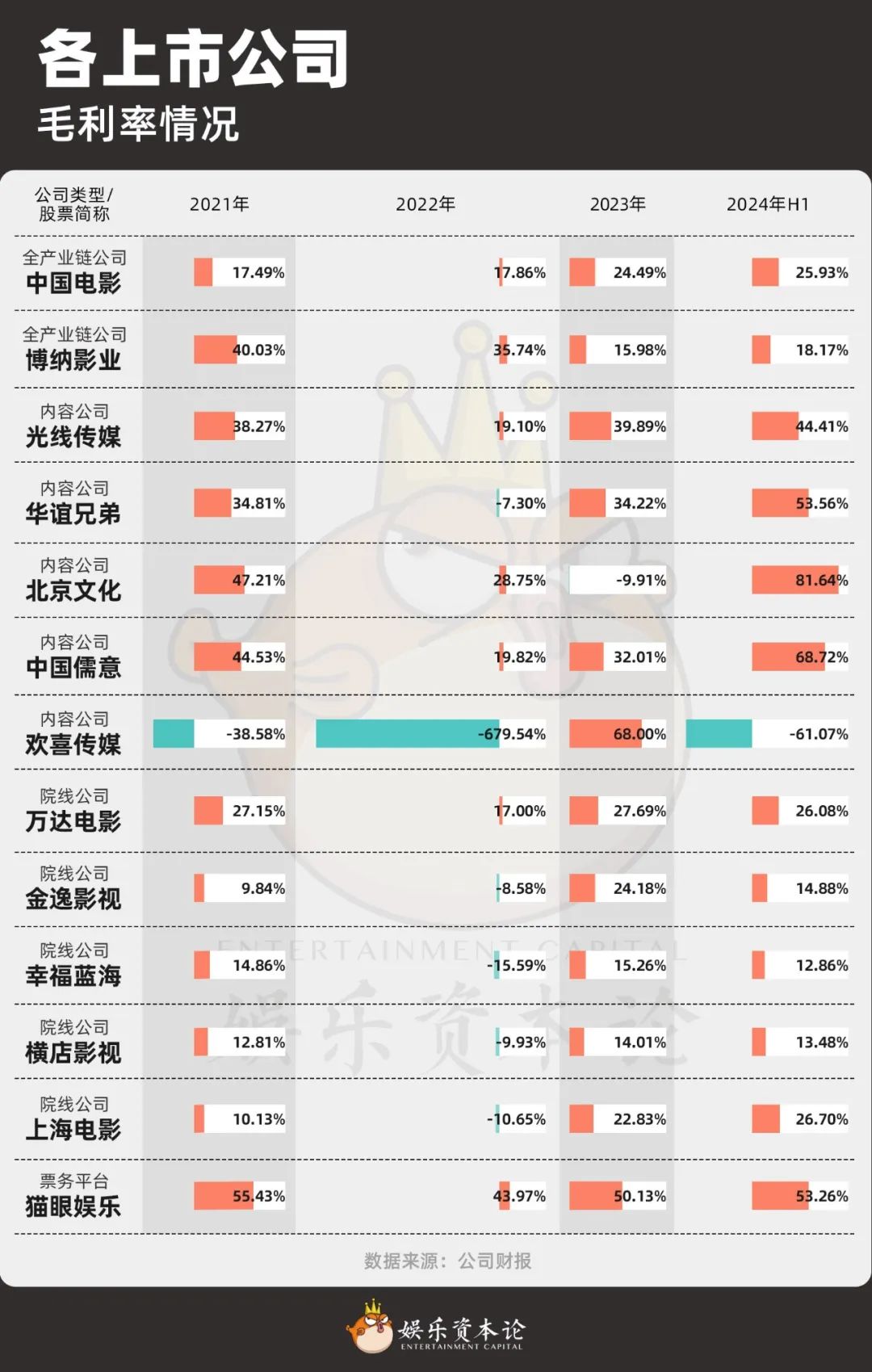 与内容公司相比,院线公司的营业成本多为固定支出,毛利率受到营业收入影响更大,因此业绩与电影大盘的联系更为紧密。2024上半年,几乎所有院线公司的放映业务毛利率都出现了大幅下降的现象。