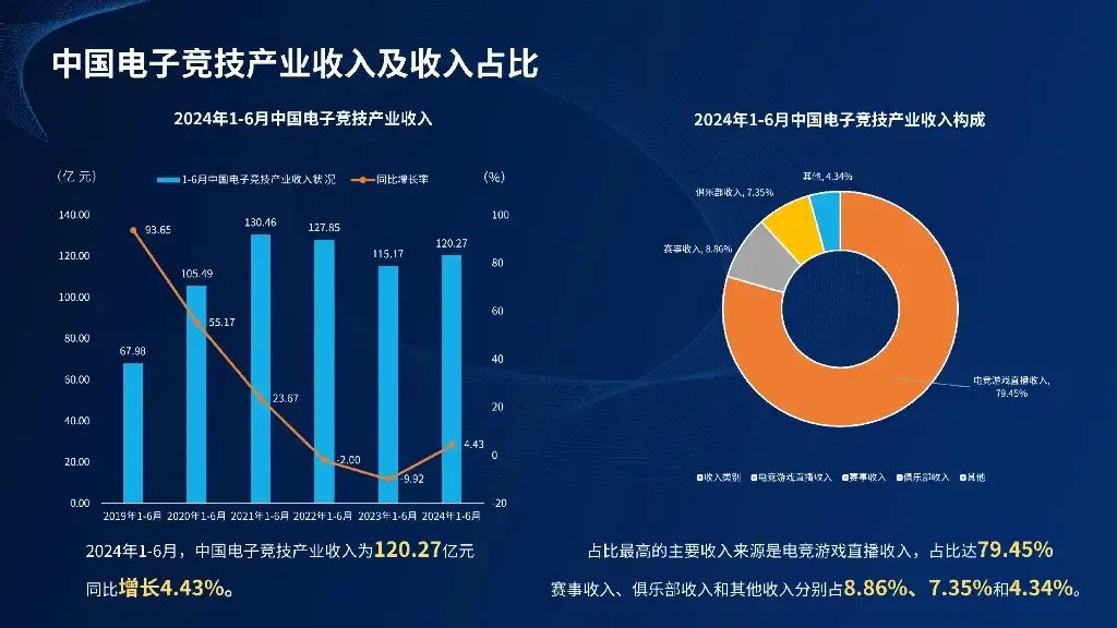 虽然《战至巅峰》IP看起来是稳步向上的,但电竞却不再像前几年那般“热”。据《2024年1-6月中国电子竞技产业报告》显示,今年上半年电竞产业实际销售收入同比增长4.43%,用户规模约4.9亿同比增长仅有0.52%,在收入构成方面电竞游戏直播占比最高达79.45%。也就是电竞市场规模趋于稳定,主要经济效益回归用户日常化的直播打赏。