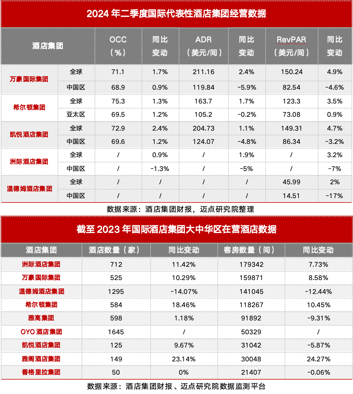 小结:2024年上半年,各大国际酒店集团OCC表现较好,全球及中国区整体实现提升;RevPAR、ADR全球实现增长,中国区则普遍出现下滑。