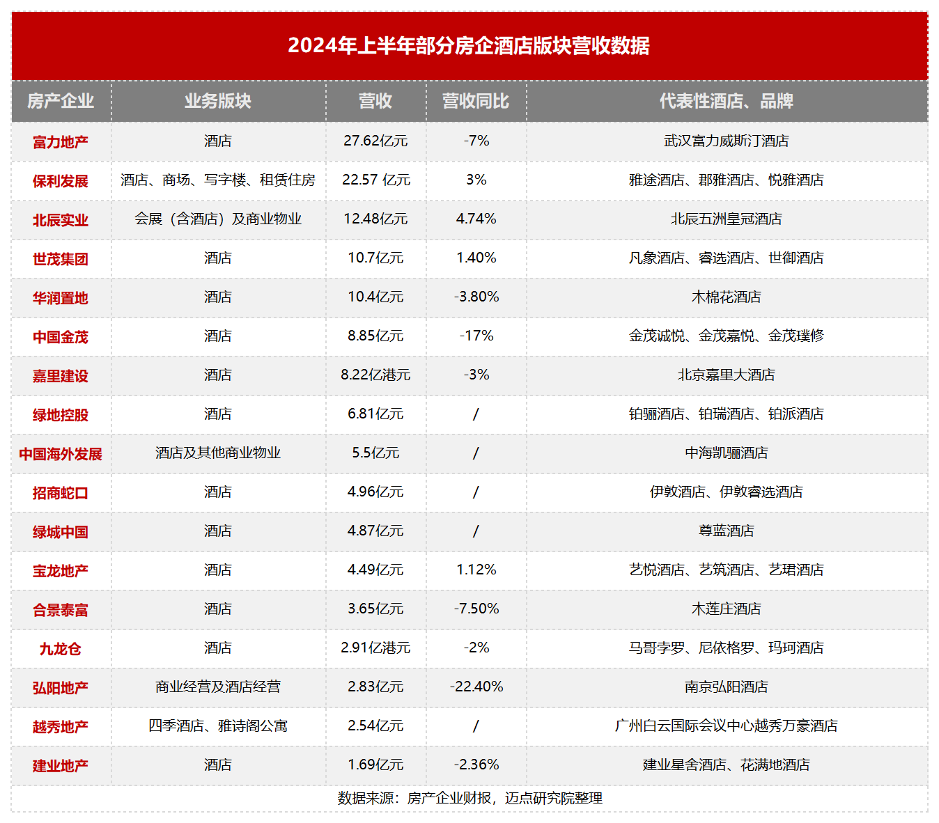 小结:2024 年上半年,高端及奢华酒店占比较高的房企酒店营收普遍出现同比下滑,而中高端酒店占比较高且有自营品牌的房企,则营收出现了同比增长的情况。