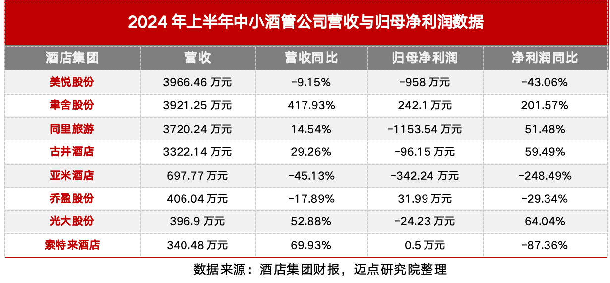 营收及同比层面:盘点8家新三板上市的中小酒店管理公司发现,其整体经营受市场环境、客群消费及业务升级影响较大,短期内出现问题易被资本市场放大。营收情况来看,美悦股份、聿舍股份、同里旅游、古井酒店上半年都是3000万元级别,亚米酒店、乔盈股份、光大股份、索特来酒店则不足千万。归母净利润来看,仅聿舍股份实现同比大涨,同里旅游则是亏损减少,其他基本都在盈亏平衡线。