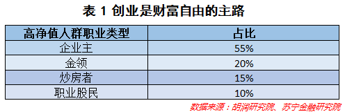 胡润研究院研究了资产净值在千万以上的高净值人群的职业分布,发现企业主占比达到55%,是高净值人群的主体。
