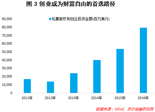 从数据上看,越来越多的人开始选择创业作为实现财富自由的途径。以私募股权和创业投资金额为例,2016年投资金额794亿美元,同比增加47%,达到了历史新高水平(参见图3)。改革开放后不断的财富累积,以及新的消费群体和消费理念的出现,使得消费等需求得到充分的释放,配合上国家鼓励大众创业,创业面临细分化需求和国家政策的双重支撑。