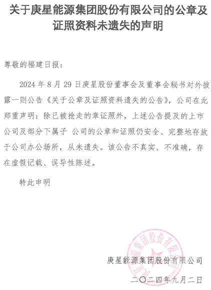 汤永庐发给福建日报的声明文件显示,2024年8月29日庚星股份董事会及董事会秘书对外披露一则公告《关于公章及证照资料遗失的公告》,公司在此郑重声明:除已被抢走的章证照外,上述公告提及的上市公司及部分下属子公司的公章和证照仍安全、完整地存放于公司办公场所,从未遗失。“该公告不真实、不准确,存在虚假记载、误导性陈述。”