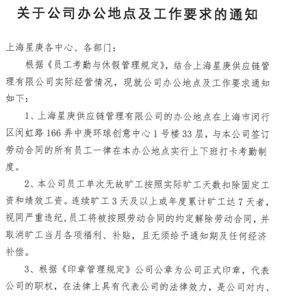 随后9月3日,汤永庐另外给界面新闻发来三份盖有上海庚星能源有限公司、上海星庚供应链管理有限公司、宁波星庚供应链管理有限公司等三家庚星股份子公司公章的《关于公司办公地点及工作要求的通知》文件显示,这三家子公司的办公地点在“上海市闵行区闵虹路166弄中庚环球创意中心1号楼33层”,与相关公司签订劳动合同的所有员工一律在本办公地点实行上下班打卡考勤制度。