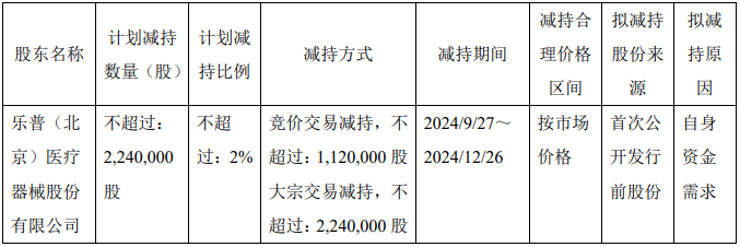 圣诺生物9月3日晚间公告,公司股东乐普医疗(300003.SZ)因股东自身资金需求,拟通过集中竞价、大宗交易的方式减持其持有的公司股份合计不超过224万股,即不超过公司总股本的2%。减持期自9月27日至12月26日。