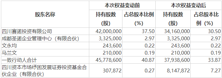股份转让前,公司实际控制人文永均、马文兰及一致行动人赛诺投资、成都圣诺企业管理中心(有限合伙)合计持有总股本的40.87%,转让完成后,实控人及一致行动人持股比例降至33.87%。