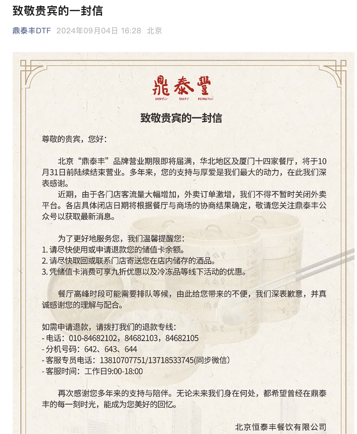 9月4日,据鼎泰丰公众号消息,北京“鼎泰丰”品牌营业期限即将届满,华北地区及厦门十四家餐厅,将于10月31日前陆续结束营业。近期,由于各门店客流量大幅增加,外卖订单激增,公司不得不暂时关闭外卖平台。各店具体闭店日期将根据餐厅与商场的协商结果确定。