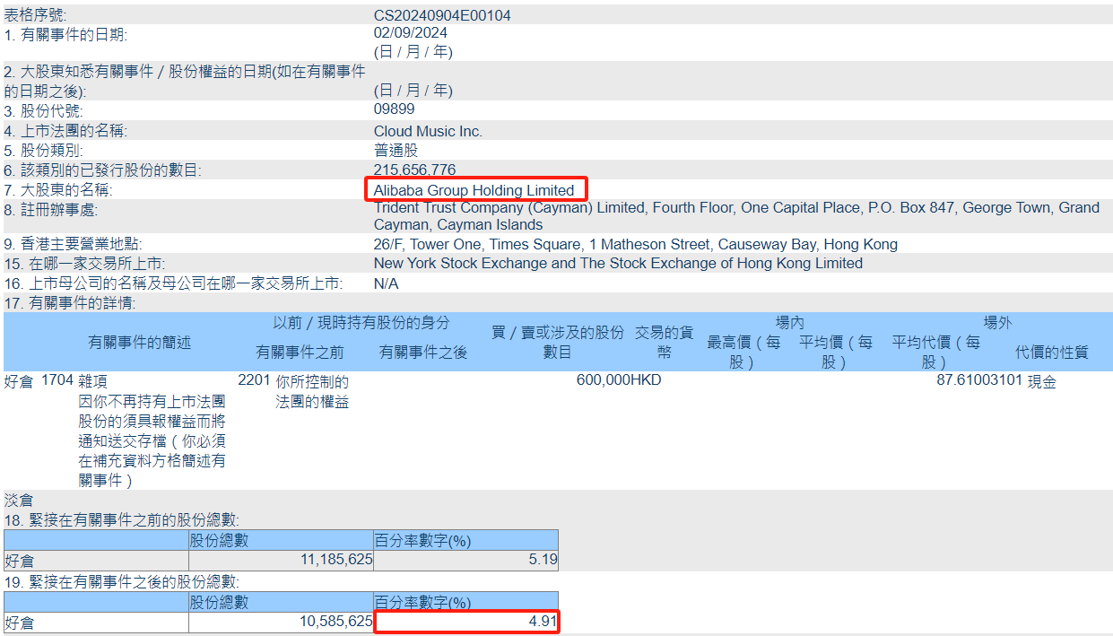 9月4日消息,据港交所文件显示,阿里巴巴将云音乐的持股比例从5.19%降至4.91%。
