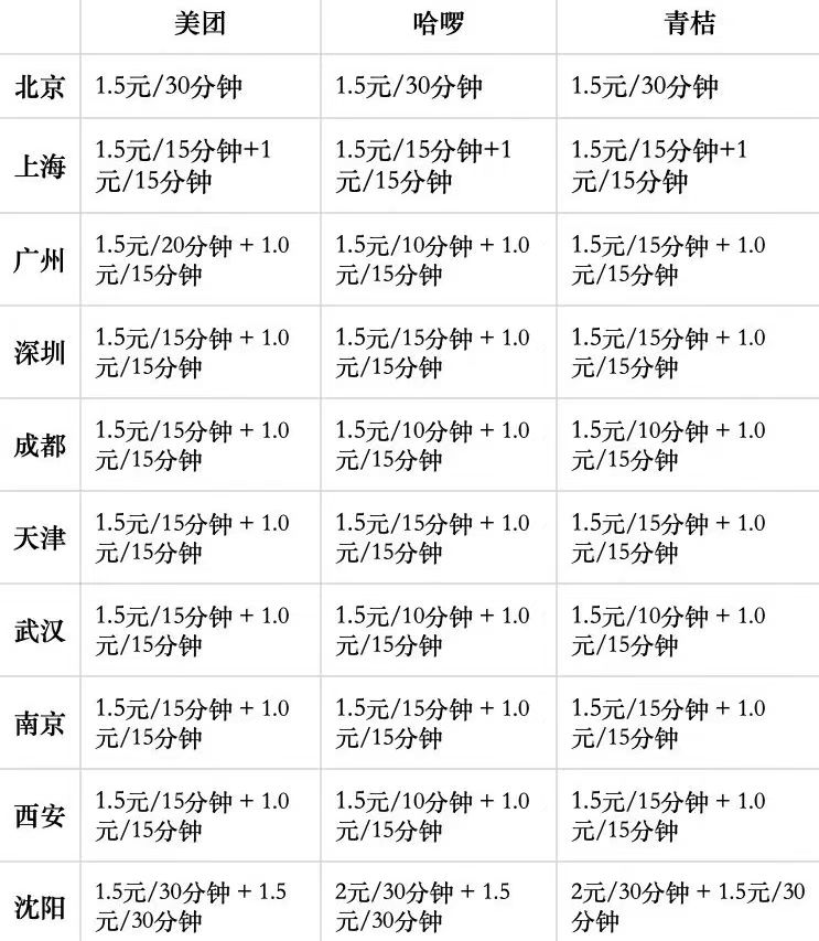 目前部分地区共享单车计价标准 图片来源:贝壳财经