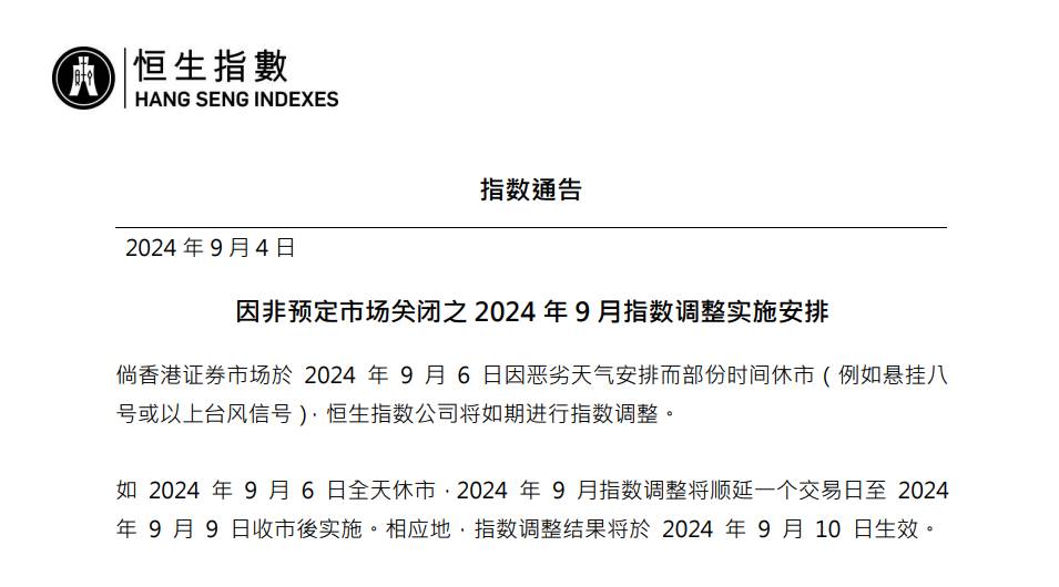 恒生指数公司9月4日发布公告,倘香港证券市场于2024年9月6日因恶劣天气安排而部份时间休市(例如悬挂八号或以上台风信号),恒生指数公司将如期进行指数调整。如2024年9月6日全天休市,2024年9月指数调整将顺延一个交易日至2024年9月9日收市后实施。相应地,指数调整结果将于2024年9月10日生效。