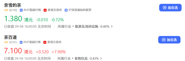 奈雪的茶/茶百道截止2024.09.04收盘价