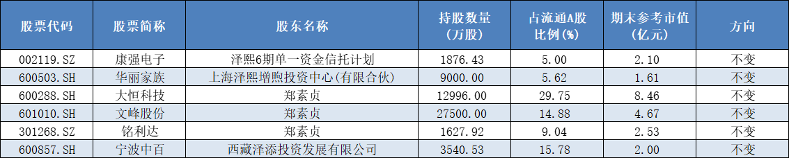 徐翔父亲徐柏良实际控制的西藏泽添投资则继续位列宁波中百(600857.SH)第一大股东,期末持仓参考市值为2亿元。