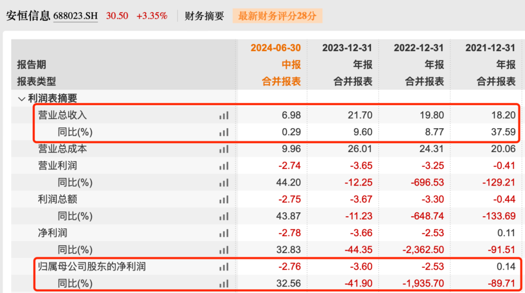 8月28日,安恒信息披露2024年半年报。报告期内,公司实现营业收入6.98亿元,同比增长0.29%;归母净利润-2.76亿元,较去年同期收窄32.56%。