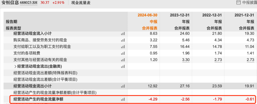 值得一提的是,自2021年开始,公司的经营现金流在持续“失血”。2021年-2024年上半年,公司的经营现金流净额分别为-0.61亿元、-1.79亿元、-2.56亿元、-4.29亿元,长期为负。