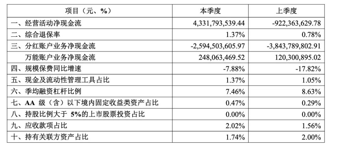 除此之外,分季度看,光大永明人寿自2023年以来的分红账户业务净现金流均为负值,并且数额巨大,2023年四个季度依次为-44.69亿元、-48.8亿元、-49.65亿元及-50.2亿元;2024年第一、二季度分别为-38.44亿元、-25.95亿元。